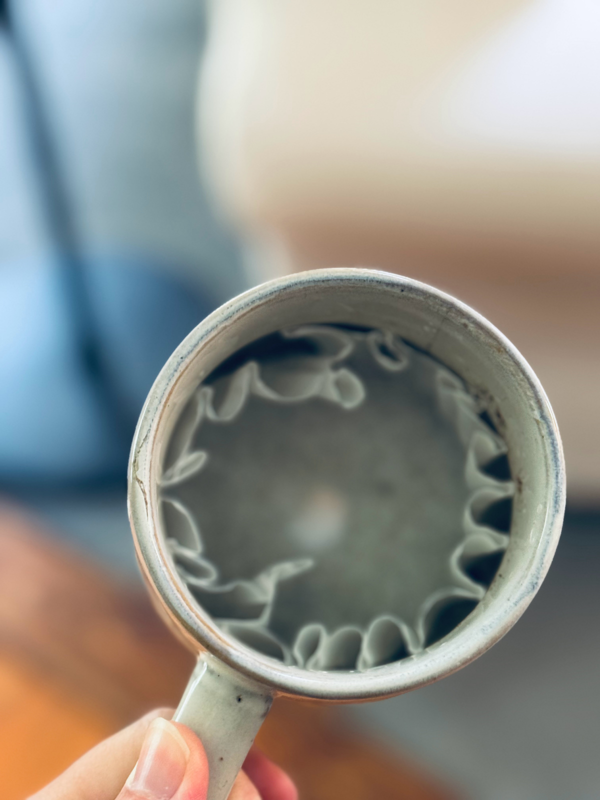 I took breaks, dumping the water back into the pyrex measuring cup to check my progress. Then, I would add the water back to the mug and keep on drilling.