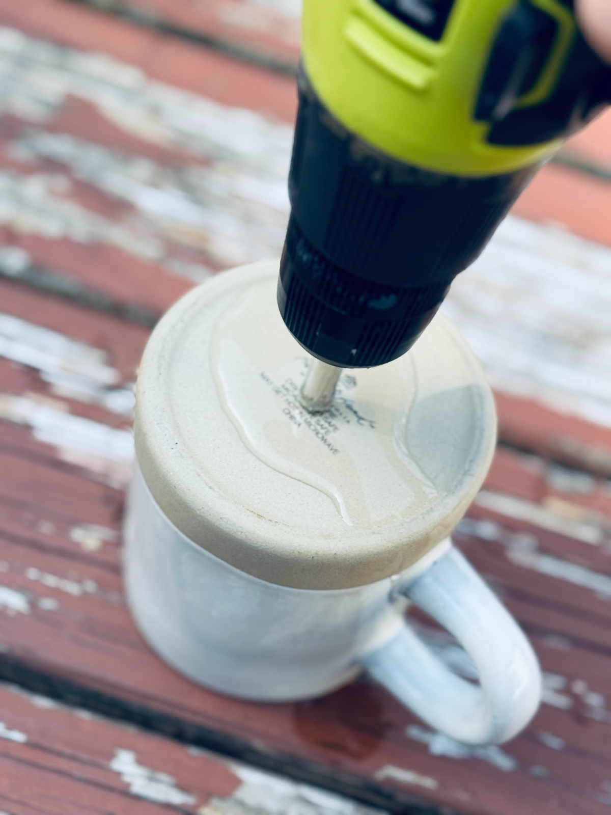 2. Prepare to drill a drainage hole through the bottom of the mug.